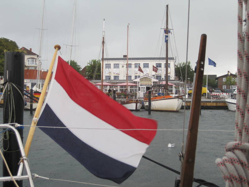 Vanmorgen hing het weerbericht van de Deutsche Wetterdienst op het prikbord. Voor vanochtend W 7/8 met golfhoogtes van 4 tot 6 meter in de Duitse Bocht. Nu is die Wetterdienst altijd wel wat zwaar op de hand; laat het in werkelijkheid eens de helft zijn, dan zijn het nog behoorlijke bulten water. Zoals het er nu uitziet, is er a.s. vrijdag een klein weergaatje, daarna pas weer maandag of dinsdag. De Duitse gastenvlag blijft dus nog wel even hangen. Af en toe eens een onweersbuitje en daartussen door zonneschijn. We liggen redelijk tegen de wind beschut. Zelfs Marian is al wat minder ongedurig. Zal ook wel moeten natuurlijk, want we zullen ons er toch naar moeten schikken. Langzamerhand komt ook de datum, dat ik weer aan het werk moet (uiterlijk 1 september) wel akelig dichtbij. Komt tijd komt raad denken we dan maar. Alles beter dan Marian met veel te veel wind in de Duitse Bocht te confronteren, want dan wilt ze waarschijnlijk nooit meer mee. Wat een voordeel is, is dat alles hier uiterst relaxt gaat, we houden nog echt vakantie en kunnen het grootste deel van de dag buiten zitten.