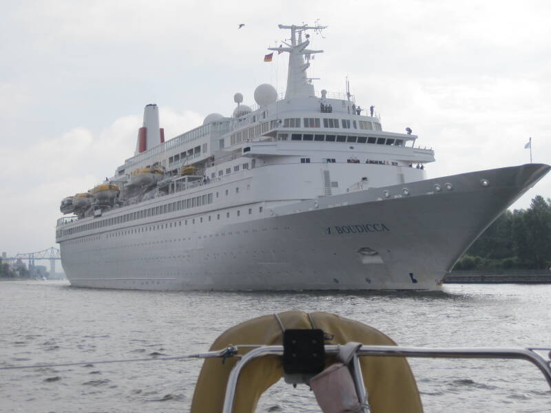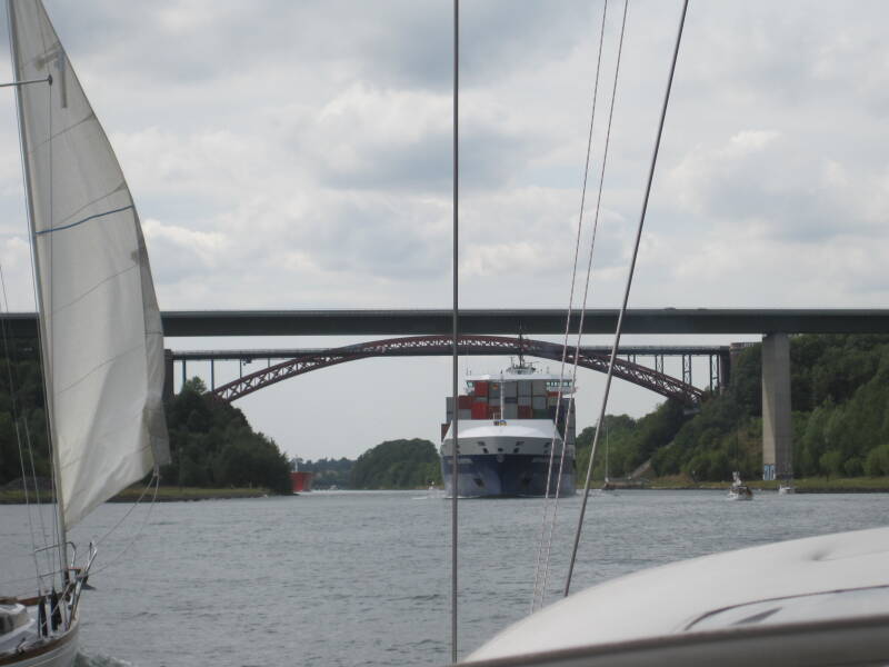 Gisteravond zijn Jet en Jan, van een Nederlandse zeilboot, die schuin tegenover ons lag, om een borrel geweest en hebben we het gehad over de terugreis en dan met name het benodigde weergat, om de Duitse Bocht door te komen. Toen was de berichtgeving nog, dat er dinsdag a.s. oostenwind van redelijke kracht was voorzien. Vanmorgen gaven de diverse weerprogramma's aan, dat er met ingang van het a.s. weekend alweer een depressietrein aankomt met harde westelijke winden. Wij hebben in eerste instantie besloten, om vandaag de resterende 60 km van het Noord-Oostzeekanaal af te varen, naar Cuxhafen te varen en dan vrijdag naar Norderney en zaterdag naar Lauwersoog. Ook voor zaterdag zag het er nu weer slecht uit. Onze ervaring van de laatste week is, dat na 20:00 uur, de wind grotendeels afneemt, dus besluiten we, om dan maar gelijk donderdagavond en -nacht door te varen naar Norderney (ca. 67 mijl) en indien mogelijk gelijk door naar Lauwersoog. In de sluis bij Brunsbüttel, kwam nu de Checkmate naast ons liggen en die hadden het plan om vrijdagmorgen vroeg uit Cuxhafen te vertrekken en dan in één ruk door te varen naar Colijnsplaat. Zij steken 2,95 meter diep en kunnen niet door Friesland, niet onder de brug bij de Roompotsluis door en alleen bij Stellendam bij laag water en bij de Nieuwe Waterweg naar binnen. Wij besluiten om door te gaan richting Norderney en daar dan vrijdagochtend verder te zien. We vertrekken 's-morgens om 9:00 uur uit Borgstedt bij Rendsburg, gaan in Cuxhafen nog even tanken en varen dan door.