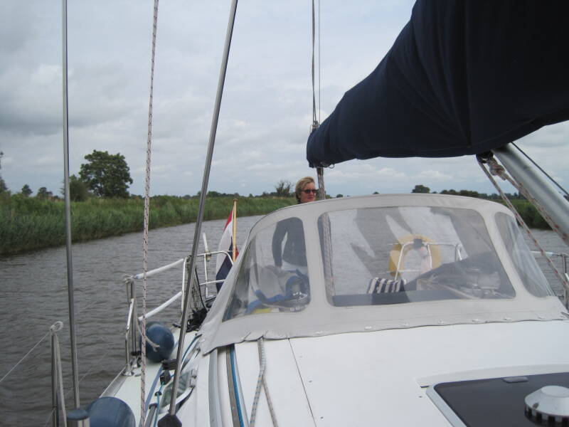 We werden wakker van Nederlands gepraat op de steiger. Dat hadden we al lang niet meer gehoord. Na een heerlijke en rustige nacht eerst eens even met het thuisfront gebeld, een aantal hadden al via marintraffic.com gezien dat we weer in het land waren. Het waaide vanmorgen nog een dikke W5, blij dat we de keus hebben gemaakt om de vorige nacht door te varen in plaats van deze. We lopen nog even rond op de dijk en ik zie overal auto's staan met Nederlandse nummerborden. De afgelopen maanden had ik steeds van: "Hé, een Nederlandse auto", ook dat is even wennen. Ik ben nog nooit zo lang uit Nederland weggeweest en had er nooit bij stil gestaan, dat dit soort dingen je opvalt. We gaan rond 12:00 weg en nemen gelijk de Robbengatsluis van Lauwersoog, varen over het Lauwersmeer en daarna wat kanalen tot Dokkum, waar we afmeren, ca. 12 mijl. Inmiddels zijn de weerberichtenmakers het er over eens: de eerst komende week alleen depressies met veel wind en elke dag regen, dit met lage temperaturen. We zagen op de sluis al een bord, waarop aangegeven, dat de Oude Schouw brug, vlak voor Sneek, die in april al is beschadigd, nog steeds voor ons formaat mastlengte is gestremd. Het was een beetje onduidelijke tekst. Je kon een nummer bellen voor meer informatie. Ik gebeld, het bleek de voorlichting van Rijkswaterstaat te zijn. De mevrouw aan de telefoon wist niet precies waar ik het over had, maar na enig opzoeken had ze bedacht dat dit alleen voor de beroepsvaart gold. Ik vertelde dat er op onze boot een mast staat, maar ze dacht toch dat het wel zou gaan. Uiteindelijk kreeg ik het nummer van de brugbediening die zou misschien wat meer gerichte info hebben. Dat bleek een bandje te zijn, met de bedieningstijden van de bruggen in Friesland. Toen het calamiteitennummer daarvan gebeld. Die wisten het ook niet en adviseerde om er maar gewoon naar toe te varen (een hele dag varen en weer een hele dag terug) en daar ter plekke na te vragen. Een telefoonnummer van de brugwachter had ze niet. Tja, met RWS ambtenaren had ik niet zo heel veel anders verwacht. Het viel me alleszins mee dat ze niet zeiden "Daar gaan wij niet over". Via internet op de site van Schuttevaer bleek, dat we er inderdaad niet doorheen kunnen. Het aangegeven alternatief over Akkrum is i.v.m. onze diepgang voor ons niet bevaarbaar. We moeten dus via Harlingen en een stukje over het wad naar Kornwerderzand en zo over het IJsselmeer weer naar het zuiden. Even uitkienen op welke dag we het stukje buitenom gaan, want er zijn een paar dagen bij dat ze daar W7 (uiteraard moeten wij naar het westen varen) voorspellen. Lijkt ons daar dan niet prettig.