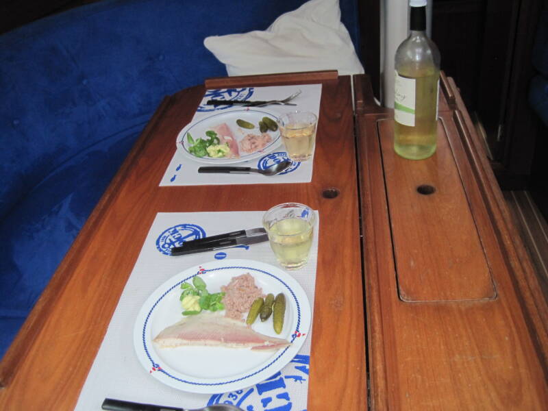 Het eerste wat Marian doet, als ze wakker is, de weerberichten afstruinen; Windguru, Gribfiles, MSN-weer, Windfinder, enz.om te zien of er toch maar niet wat minder harde wind komt. Het is helaas zelfs anders: Tot en met volgende week dinsdag nog steeds te harde westenwind in de Duitse Bocht. We moeten de knop maar even omzetten en ons schikken naar de omstandigheden. Het is hier trouwens best aardig vertoeven. Vanmorgen met de hier ter beschikking staande (goede) fietsen, maar eens een mooi stuk gefietst, straks stuk langs kanaal wandelen, vanavond BBQ, etc. Want ondanks de harde wind, zijn de temperaturen goed en schijnt regelmatig de zon.
