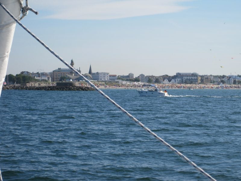Om even voor 8 uur, word ik gebeld door Marian, terwijl wij de boot aan het klaar maken zijn om uit te varen. Ze feliciteert me met mijn verjaardag vandaag. Dat was ik even vergeten. Ook nog een sms-je van Eefje. Even na 8:00 uur vertrekken we. Er staat een pittige wind. Op het programma staat een tocht naar het Zweedse vaste land: Simrisham. Een afstand over de grond van 30 mijl. Eerst een slag naar bakboord van een mijl of 5, waarna we aan de wind in 1 ruk naar de bestemming kunnen. Het is wat vlagerig en de windmeter geeft af en toe meer dan 30 knopen schijnbare wind aan. Het is echter goed te doen; er zijn hier geen grote golven. Rond 14:00 uur zijn we op Zweedse bodem.