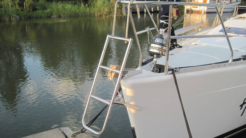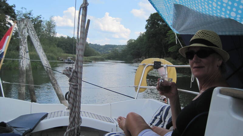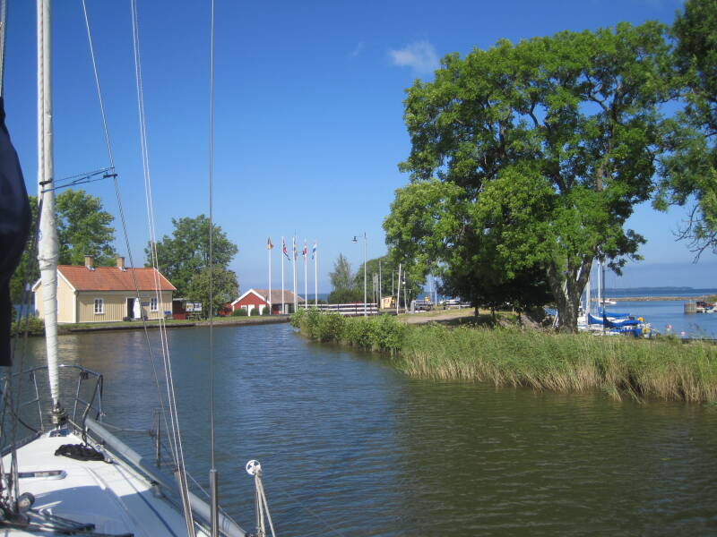 Deze keer is het Marian die naar de bakker gaat, omdat dit waarschijnlijk de enige beweging wordt vandaag. De voorspelling is 32° C en O1, dus bijna geen wind. We varen vandaag een gedeelte van het Trolhätte kanaal. Eigenlijk is het een natuurlijke rivier met een lengte van 82 km, die over een lengte van 10 km is gekanaliseerd en voor de rest wat uitgediept, om deze bevaarbaar te maken. Ze noemen het hier dan ook de Trolhätte Älv, wat rivier betekent. Daarnaast zijn er 6 sluizen in gemaakt, waarvan één 3-trapssluis. We zakken daarmee in totaal 44 meter. Er staat altijd een stroom van 1,5 tot 2 knopen mee, richting Göteborg. Tijdens het schutten in de 3-trapssluis, raakte de motor van een Duits zeiljacht onklaar, zodat we deze mee naar beneden hebben gesleept en na de sluizen aan een ponton gelegd. Later bleek dat ze een enorm stuk visnet rond de schroef hadden. We overnachten na een 22 mijl varen in het piepkleine haventje van Lilla Edet. Ik kan met zo'n naam, de associatie met roze toiletpapier maar niet loslaten. Heerlijk onder schaduw van de berken gebarbecued. Voor een volgende keer, zorgen we een goed schaduwzeil bij ons te hebben (je zal zien, dat we die dan tegen de regen moeten gebruiken). Ik heb vandaag de masthoogte t.o.v. de waterlijn nog eens nauwkeurig opgemeten, omdat ik ging twijfelen aan die 18,10 meter die in mijn hoofd zat. Het bleek inderdaad wat "te hoog gegrepen". De bovenkant van de antenne is 17,40 meter. Goed voor een volgende keer om te weten.