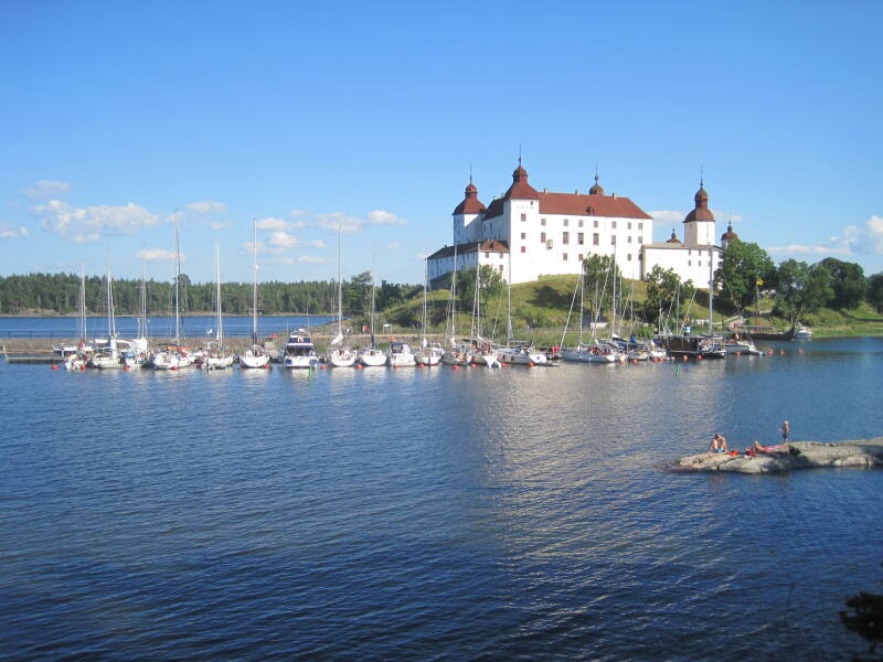 We worden weer door de zon en de warmte wakker. Direct tegenover de boot is een broodje-met-vis-zaak, die ook baquettes levert. Na douchen en ontbijt, zoeken we de ruimte en verkoeling op. We zeilen vandaag naar Läckö. Met de ZO 3 een ruim bezeilde koers. Als we aankomen hebben we 21 mijl op het log. Een uiterst leuk plaatsje op het schiereiland Spiken. We liggen direct achter Läckö Slott, een 12-eeuws kasteel. Het haventje is onvoorstelbaar mooi, weer een uitgesproken hoogtepunt van onze reis. Rondom een natuurbos. Direct naast het slot is een Naturum; een informatiecentrum over de Vänern en de omliggende natuur. Zo blijkt, dat tot 1937, er een open verbinding was met de westelijke oostzee. Na die tijd is het Trolhättekanaal aangelegd, de aansluiting met de Oostzee met sluizen afgesloten, zodat er een meer ontstond. De afwatering van smelt- en regenwater geschiedt sinds die tijd naar het westen, via het Göta Ālv, de Göta rivier. Het is hier heerlijk zwemmen in de natuurlijke haven, het water is ruim 23 graden C. De kuip ligt naar het westen gericht, dus tot in de late avond de zon, dit samen met de hoge temperatuur maakt het onvermijdelijk dat we weer op de Cobb gaan barbecueën. We besluiten om hier morgen nog een dag te blijven, er is zoveel te zien en te doen. We betalen hier inclusief alles 150 SEK, is ca. E 13,50. We liggen hier weer sinds meer dan een week geleden, met achterzijde aan een boei en met de voorzijde aan de steiger. Al jaren slepen we een speciale stok hiervoor mee aan boord, met een haak, die de landvast door een ring haalt op een heel ingenieuze manier. Hier komt deze eindelijk goed tot zijn recht; afmeren is een eitje. De Zweden zelf gebruiken heel vaak een RVS stok met een haak er aan, die kan worden geborgd. Dit is met afmeren net zo handig, maar met wegvaren gaat dat nog al eens mis, zeker met harde zijwind.