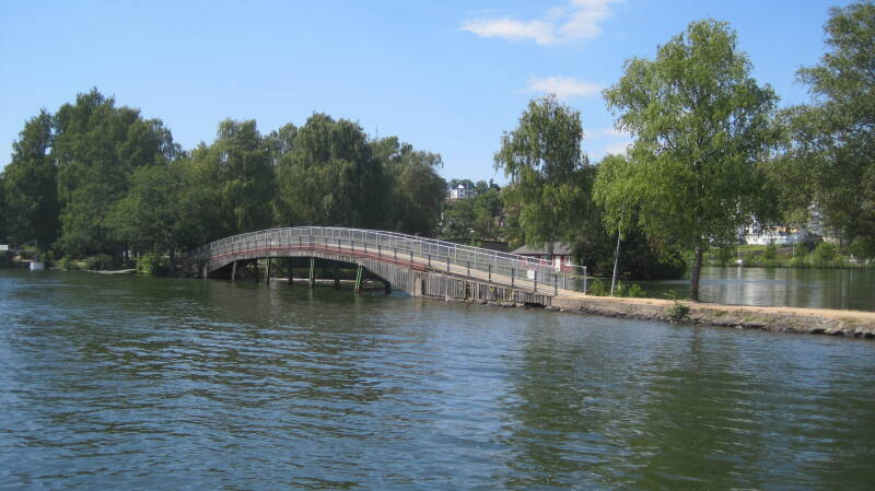 Als we om 8:00 uur wakker worden en naar buiten kijken, zijn op 2 na, alle ca. 10 passanten al vertrokken. Direct naast de uitgang van het haventje ligt de laatste sluis, waarna we weer op zeeniveau zitten. We zijn nu rechtstreeks verbonden met de Oostzee, toch is het water hier nog zoet, door de afstroming van de rivier richting zee. Verderop is ook een ingenieus zoet-/zoutscheidingssysteem. Voorlopig geen sluizen meer, we hebben in totaal nu 73 sluizen gehad en willen nus eens een poosje zonder! We hadden verhalen gehoord, dat deze rivier/kanaal niet mooi zou zijn en een industrieel uiterlijk zou hebben. Niets is echter minder waar; het is een prachtig meanderende rivier met erg mooie oevers en weelderige begroeiing. Na ongeveer 18 mijl zijn we bij Kungälv en besluiten daar te stoppen; varen in de bloedhete zon heeft zijn grenzen. Om in het haventje te komen moeten we door een nauw en ondiep gangetje. De beloning is echter hoog; we liggen op een heel idyllisch plekje met een geweldig uitzicht. Het grenst vlak aan het dorp, maar daar merk je hier niets van. Waarschijnlijk moeten we morgen hier het gehele toegangsbeekje achteruit uit varen want ruimte om te draaien is er niet; in het midden is het 2,00 meter en direct daarnaast ondiep. We liggen aan een veel te kleine vingersteiger en aan de achterzijde aan een soort dukdalf, die eigenlijk als boei dienst doet. Water tanken kan hier niet en de enige stroom die er is zit niet in een stopcontact, maar in het water; zo'n mijl per uur. Later op de middag arriveren Henk en Ellen op de fiets, die liggen juist buiten de haven aan een wachtsteiger. We drinken koffie en aansluitend een borrel bij ons aan boord. Na het eten is de temperatuur wat dragelijker en maken we nog een wandeling.