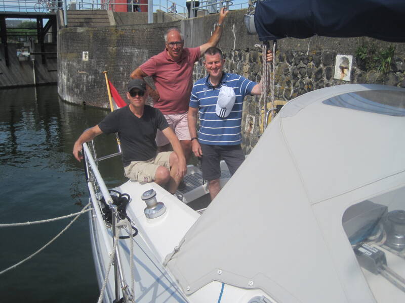 Rond 12:00 uur kwamen Adrie en Carel aan in Wolphaartsdijk. Na spullen te hebben uitgepakt, hun slaaphutten te hebben ingericht, hebben we gezamenlijk koffie aan boord gedronken. Ook Marian, Petra (de vrouw van Carel), Martin (de zoon van Adrie), onze dochter Eefje met haar vriend Martijn en hun dochtertje Elin en Jan van Soelen waren van de partij.